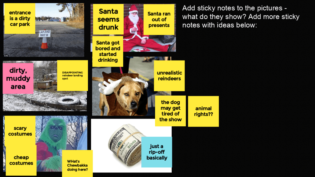 - Pre-Writing 1 – Establish the Context. Ask learners if they can think of some typical Xmas entertainment in their own or other countries, as relevant e.g. Xmas markets, Xmas fairs, Santa’s Grotto etc. Ask them if they know what a “Drive Thru” Wonderland experience is. Show a clip of one in action e.g. 4.50 – 5.20 here. You could ask: would you enjoy it? Would younger children enjoy it? Find out if they think these events are a good idea in general (in my experience this draws mixed views including thoughts on the brash commercialism of Xmas). Share your screen again, showing frame 1 of the Jamboard link: tell them this is one such event happening in England this year. Ask them to quickly read the website information in frame 2. Their task is to pick out 3 or 4 “experiences” children / families can have. After they have done so, ask again if it seems appealing and why / why not. Wrap up this stage with frame 3, bridging to the next by asking what could go wrong? Elicit one or two ideas (e.g. students have suggested to me that the customers caught covid – thankfully this is not the case!).