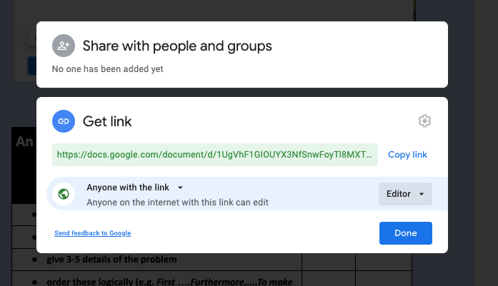- While Writing 1: Settling In. The Central Google Doc should have links named e.g. Room 1, Room 2, Room 3, corresponding to the breakout rooms students are working in. When you create these, make sure you click the blue Share button in the top right of the Google Doc and then set access to the option that Anyone on the internet with this link can edit (see the image above). Paste the link into the Central Google Doc; highlight it; click the Insert Link icon to make the URL a direct clickable link. For one final step, select the whole URL and you’ll see an option to rename it according the title of the document. Click this. Repeat with however many rooms / docs you need (if this seems fiddly, it’s not as bad as it sounds! A more detailed explanation can be found here).