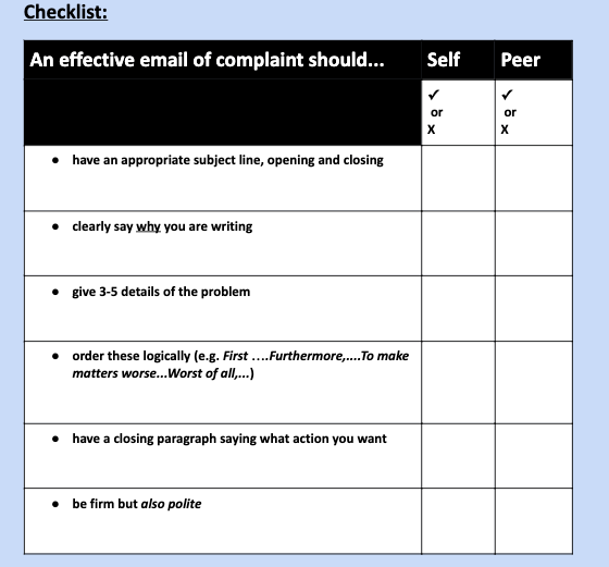 - Post-Writing 1: Self-assessment. Students can evaluate their own work, using for instance a checklist (see below for a better example than the one in the image above). You can build in time for this once they complete the writing, asking the group to check whether they have included what they need to, and giving them time to do any last-minute editing.
