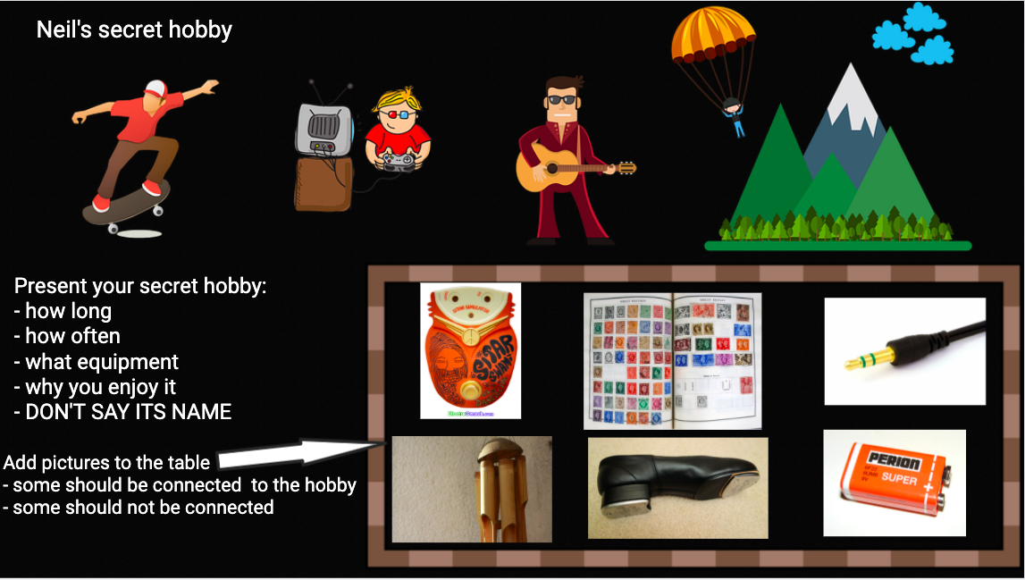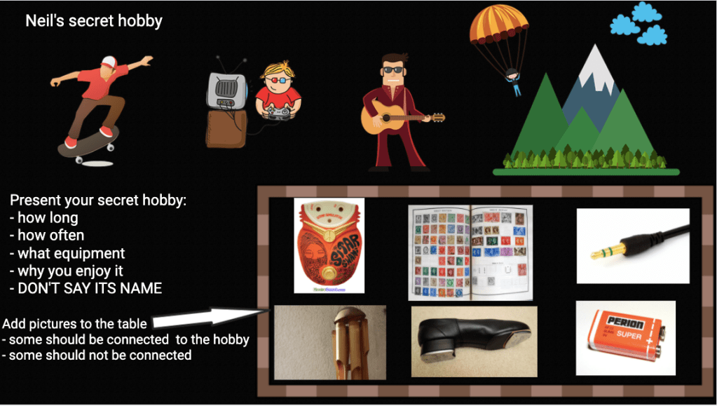Students select a hobby they have that the other learners don’t know about, then prepare and give a presentation about it, with distractors, without saying what the hobby is. The others in the group have to try to guess it. If there are “no secrets” between the learners, the hobby can be made up (have a list ready for the students)