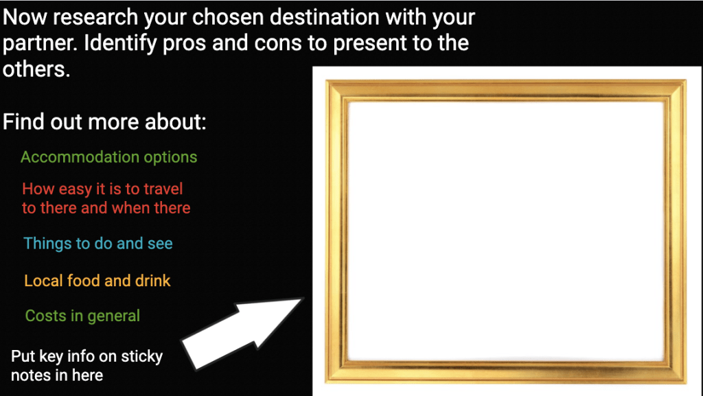 • Draw attention to the next task, on frame 4: they should now research their destinations against the given criteria (accommodation, ease of travel, attractions, food / drink, cost). Within groups, if you prefer, different criteria can be allocated to different students. Brainstorm sites they can use: Wikipedia, Rough Guides, TripAdvisor, etc. Edit: Neil Mc just recommended kayak.co.uk as a good single source. This can be done as homework if it is more manageable, but I don’t personally have an issue with 15-20 minutes of research in class, with me as the teacher moving between BORs checking in and troubleshooting. Further edit: hot off the press Neil Mc has shared a worksheet he made for his students when he has a go with this task this week – find it directly below the procedure. The level of detail and scaffolding needed on a worksheet will vary depending on how successfully you think your students will be able to research the area. But this is a very useful example.