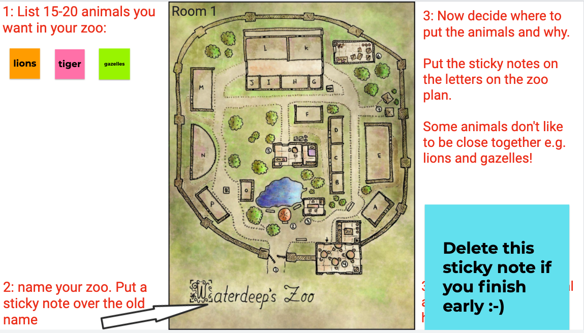 • The stages of the task are indicated on the Jamboard frame above: 1) students first brainstorm 15-20 animals they might or would like to find in a zoo (feel free to let students pick extinct or fantasy animals if this motivates them further). They can then imagine the relationships between the animals – which would live near each other with no problem? Which should be put in different parts of the zoo and why?
