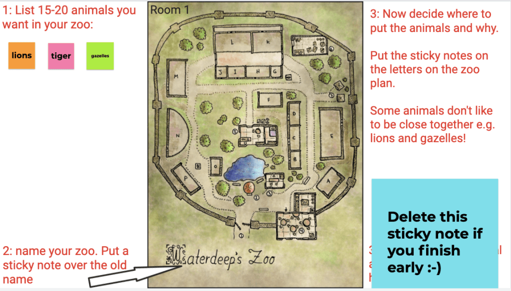 This is a version of an old classic. Jamboard works really well for this as a synchronous problem-soving / creative task in which learners need to create a zoo, placing the animals to maximise their well-being (I know, zoos and animal well-being…). My experience is that the Zoo format works better with learners younger than teens, so I have added an alternative where students create an ideal holiday village, filling it with the facilities they desire.