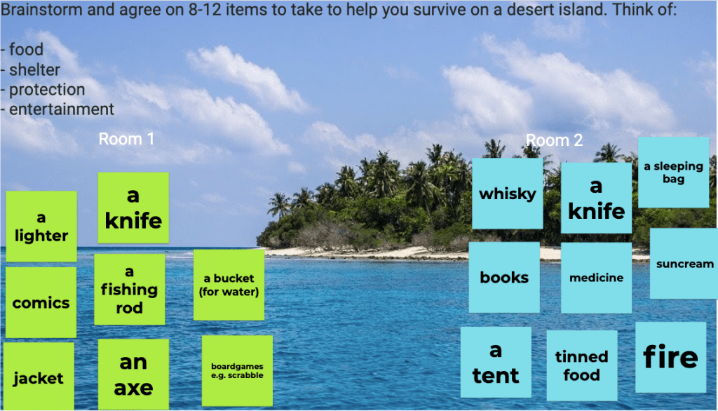 Another classic, and another task that is flexible: the desert island survival task, which works very well with brainstorming on Jamboard. Students in rooms brainstorm 8-12 items they would take to help them survive on a desert island. They agree in their group and then argue, whittle down etc. with the other groups.