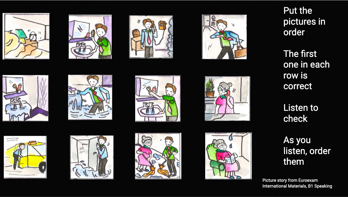 I included this in my talk for a couple of reasons a) to show that tasks can be based around receptive skills and input-oriented, as well as being productive b) to show how tasks can work in exam classes. Here, the picture story is taken from Euroexam B1 Speaking. Rachel Tsateri has a wonderful post on jumbled picture stories from last November here.