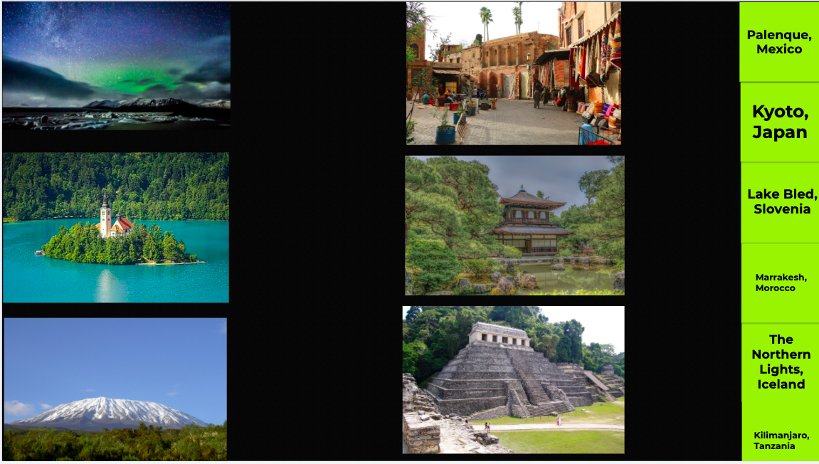 • The shortlist is 3 or 4 depending on how many students you have (with very large groups, you could keep all 6). Having agreed on a shortlist, allocate a destination to each group of 2 or 3 learners e.g. group A has Kyoto, group B has Lake Bled, group C has Kilimanjaro etc.